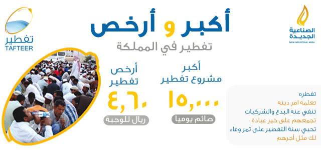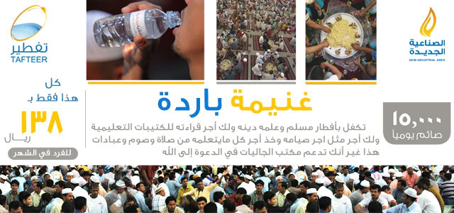 بحثت عن ارخص وأفضل تفطير في جميع الجمعيات فوجدت ان في مكتب جاليات الصناعية الجديدة قيمة تفطير الصائم 4.60 ريال ( أربع ريالات وستون هللة فقط ) هذا غير انهم يعلمونه ويدرسونه دينه ويعطونه كتيبات واشرطة مع الوجبة مجانا تفطير ودعوة