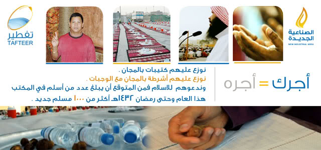 فقلت في نفسي أنها غنيمة باردة وتجارة رابحة أتكفل بأفطار مسلم وأعلمه دينه ويأخذ كتيبات تعليمية وآخذ أجر مثل اجر صيامه وأجر كل مايتعلمه من صلاة وصوم وعبادات هذا غير أني ادعم مركز الجاليات للدعوة كل هذا فقط ب 138 ريال بحيث أفطر 30 شخص وأكون كأنني صمت رمضان آخر