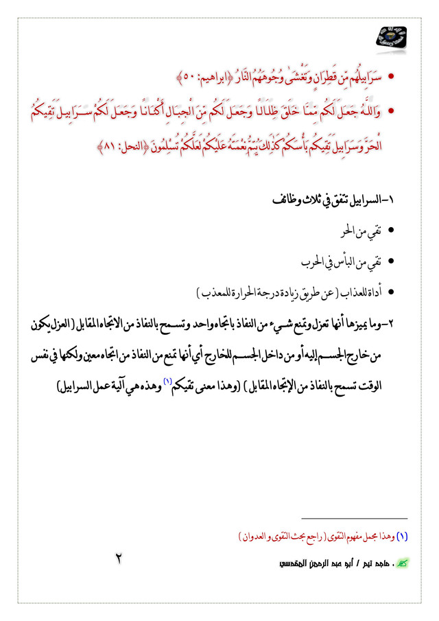 ([3]) ... وَجَعَلَ لَكُمْ سَرَابِيلَ تَقِيكُمُ الْحَرَّ ... ﴿النحل: ٨١﴾