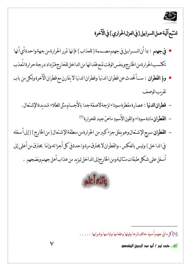 - القطران سريع الإشتعال وهو ينقل جزء كبير من الحرارة من منطقة الإشتعال ( من الخارج ) ( إلى أسفله في الداخل ) وليس بالعكس ، والقطران لا يحترق مرة واحدة في كل أجزائه وإنما يحترق من أعلى إلى أسفل على شكل طبقات متتالية ومن الخارج إلى الداخل ليزيد من عذاب أهل جهنم ونضجهم .