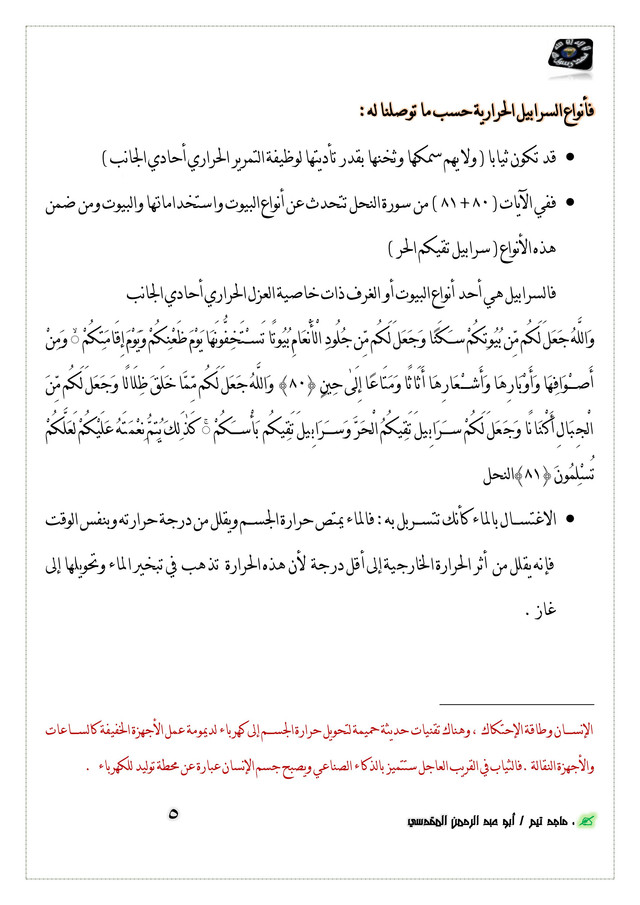 · ففي الآيات ( 80 + 81 ) من سورة النحل تتحدث عن أنواع البيوت واستخداماتها والبيوت ومن ضمن هذه الأنواع ( سرابيل تقيكم الحر )