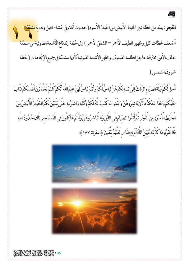 الفجر : يمتد من لحظة تبين الخيط الأبيض من الخيط الأسود( حدوث أثلام في غشاء الليل وبداية تشققه – أضعف لحظات الليل وظهور الطيف الأحمر – الشفق الأحمر ) إلى لحظة إندفاع الأشعة الضوئية من منطقة خلف الأفق مخترقة حاجز الظلمة الضعيف وتظهر الأشعة الضوئية كأنها مشتتة في جميع الإتجاهات ( لحظة شروق الشمس )
