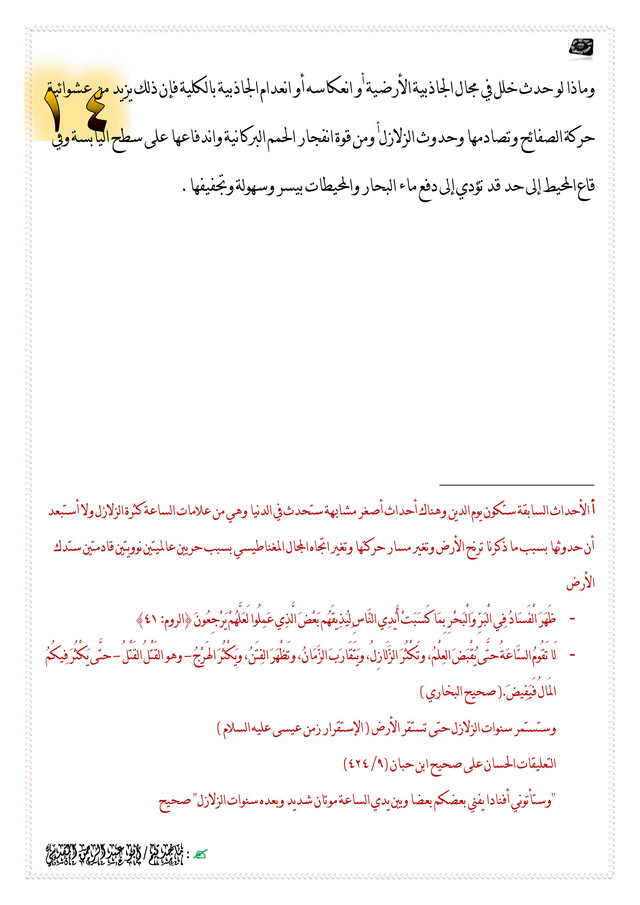 [‌ك] الأحداث السابقة ستكون يوم الدين وهناك أحداث أصغر مشابهة ستحدث في الدنيا وهي من علامات الساعة كثرة الزلازل ولا أستبعد أن حدوثها بسبب ما ذكرنا ترنح الأرض وتغير مسار حركتها وتغير اتجاه المجال المغناطيسي بسبب حربين عالميتين نوويتين قادمتين ستدك الأرض