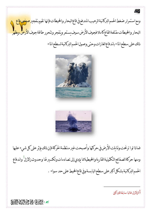 ومع استمرار ضغط الحمم البركانية الرهيب المندفع في قاع البحار والمحيطات فإنها تقوم بتفجير صخور قاع البحار والمحيطات مقتلعة القاع كاملا فجوف الأرض سوف يستعر ويتفجر وتتحرر طاقة جوف الأرض ويظهر ذلك على سطح الماء باندفاع الغازات وحتى وصول الحمم البركانية لسطح الماء