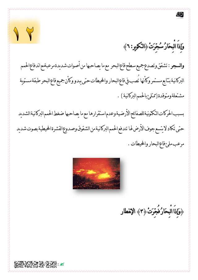 والسجر : تشقق وتصدع جميع سطح قاع البحر مع ما يصاحبها من أصوات شديدة مرعبةمع اندفاع الحمم البركانية بتتابع مستمر وكأنها تُصب في قاع البحار والمحيطات حتى يبدو وكأن جميع قاع البحر طبقة مستوية مشتعلة ومتوقدة ( ممتلئ بالحمم البركانية ) .