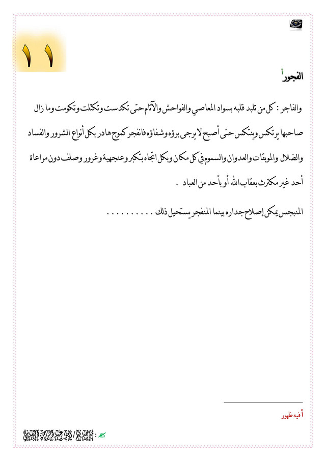 والفاجر : كل من تلبد قلبه بسواد المعاصي والفواحش والآثام حتى تكدست وتكتلت وتكومت وما زال صاحبها يرتكس وينتكس حتى أصبح لا يرجى برؤه وشفاؤه فانفجر كموج هادر بكل أنواع الشرور والفساد والضلال والموبقات والعدوان والسموم في كل مكان وبكل اتجاه بتكبر وعنجهية وغرور وصلف دون مراعاة أحد غير مكترث بعقاب الله أو بأحد من العباد .