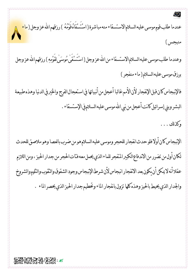 الإنبجاس كان أولا فلو حدث انفجار للحجر وموسى عليه السلام هو من ضرب بالعصا وهو ملاصق للحدث لكان أول من تضرر من الاندفاع الكبير المتفجر للماء الذي يحمل معه فتات الحجر من جدار الحيز ، ومن اللازم عقلا أنه لا يمكن أن يكون بعد الانفجار انبجاس لأن شرط الإنبجاس وجود الشقوق والثقوب والثلوم والشروخ والجدار الذي يحيط بالحيز وهذه كلها تزول بانفجار الماء وتحطيم جدار الحيز الذي يحصر الماء .
